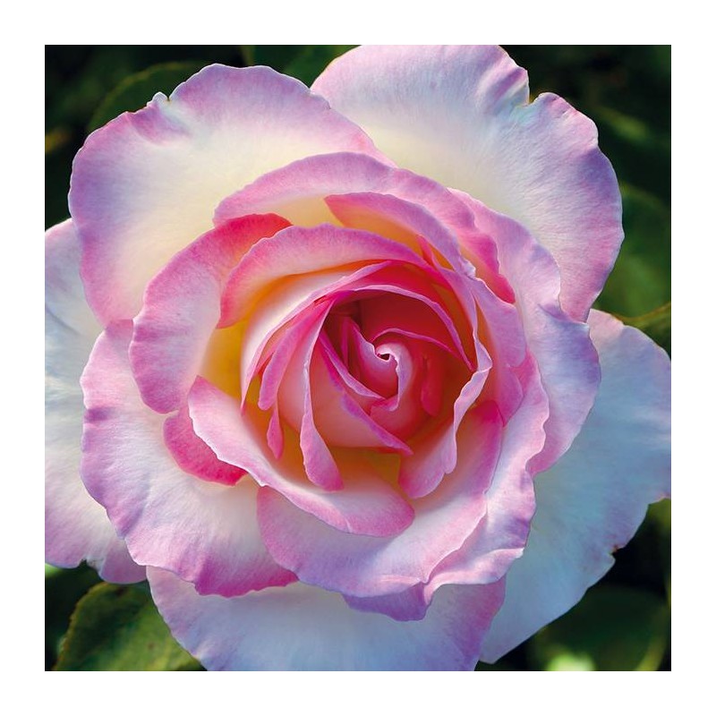 Características de la variedad: Rosal de suntuosa belleza, de hoja ancha y brillante, planta muy resistente.Con rosas blancas, crema, con un reveteado rosa.